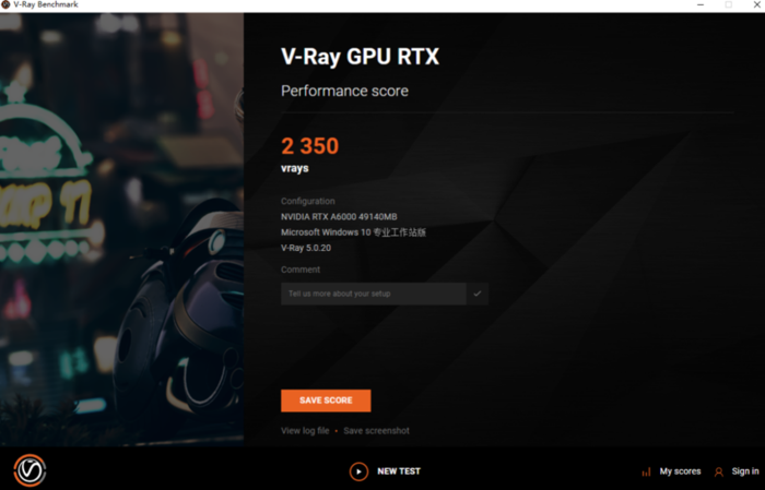 V-Ray Benchmark 5还支持RTX光线追踪渲染,RTX A6000的分数为2350vrays。