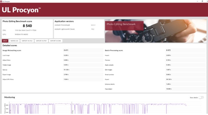 照片编辑基准测试结果的综合分数为8540,具体看子项目,Image Retouching分数为8411、Batch Processing分数为8672。