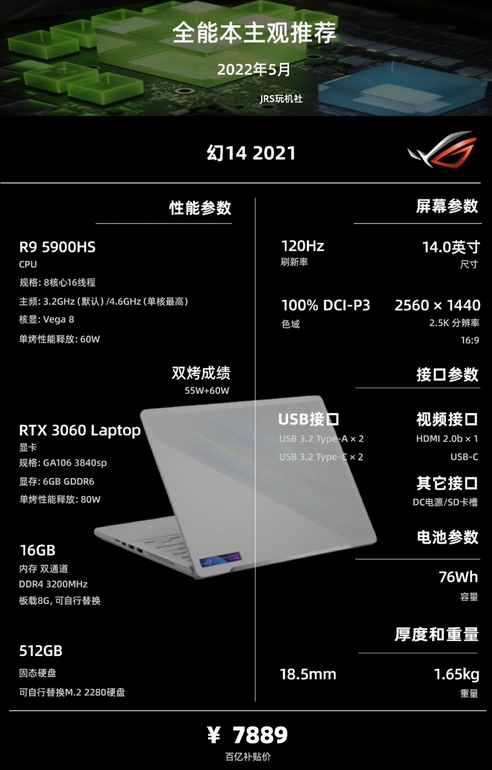 幻16 2021年是去年最火爆的全能本之一,超窄边框,均衡的产品力也使得这款产品竞争力十足。2022款的幻16模具没换,主要升级了独显直连,显卡功耗可以跑到120W,还有换了i7-12700H,幻系列8G板载+一个内存槽的设计依旧得到保留(说实话我个人不太喜欢这种设计),9999元竞争力十足,近期又有一批9999-100e卡的货,大家可以考虑这个时候上车,目测价同618。